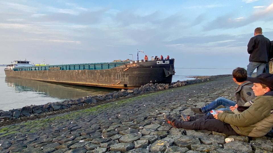 Binnenvaartschip vastgelopen tegen dijk bij Stavenisse
