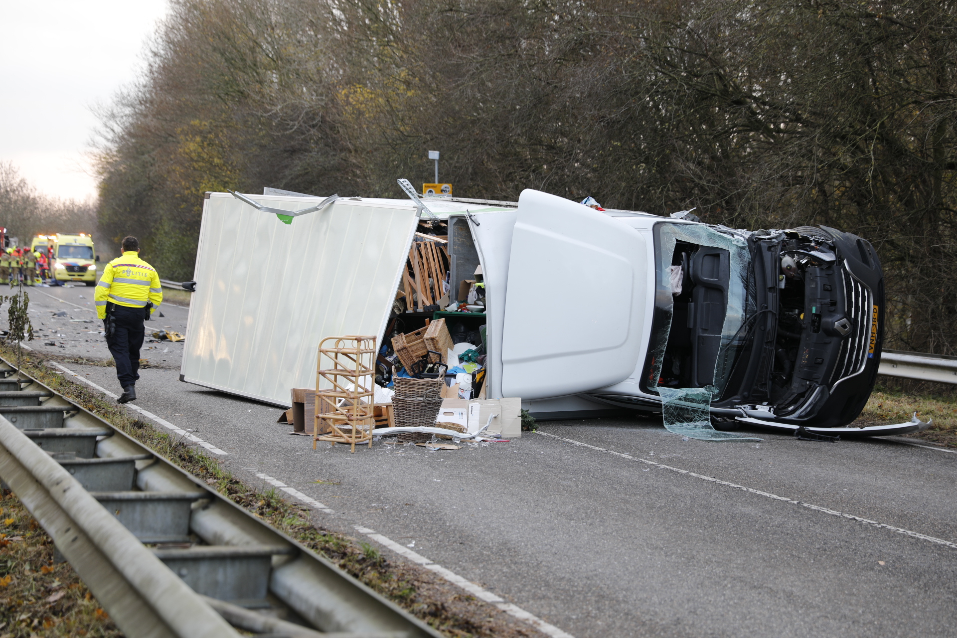 Botsing tussen bestelbus en bakwagen, ravage op de weg
