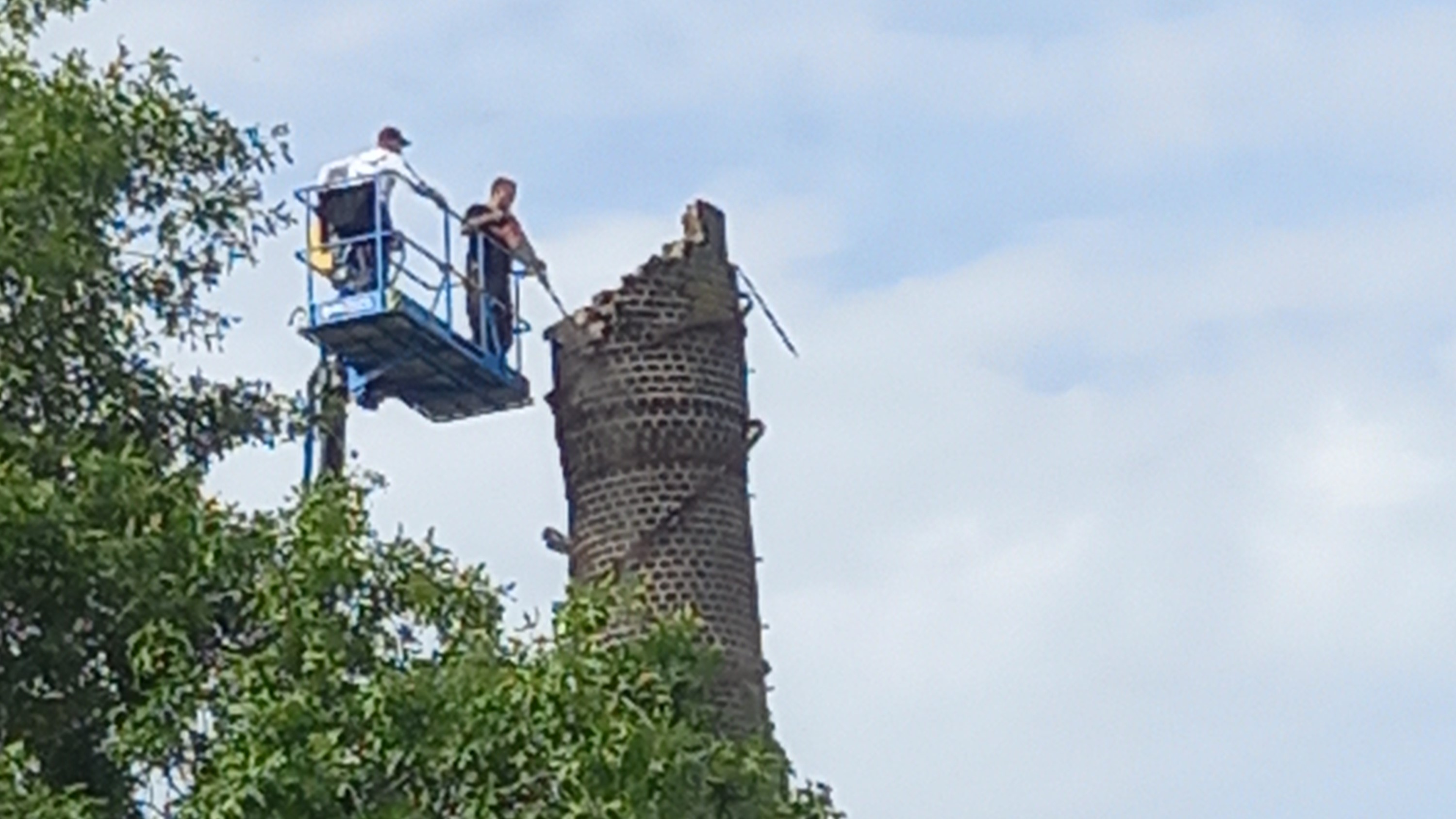 Het bovenste deel van de schoorsteen is maandag gesloopt, het begroeide deel blijft voorlopig nog staan.