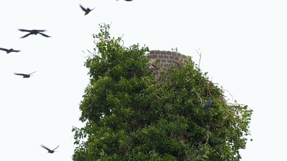 Het bovenste deel van de schoorsteen is maandag gesloopt, het begroeide deel blijft voorlopig nog staan.