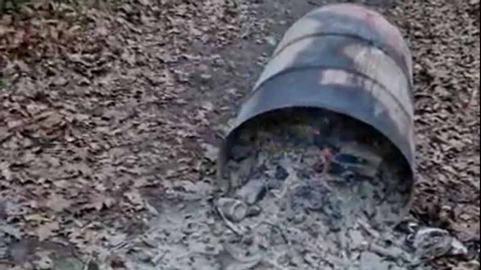 De gedumpte ton met daarin nog brandend vuurwerkafval (Beeld: melder vondst via Twitter Boswachter Erik de Jonge).