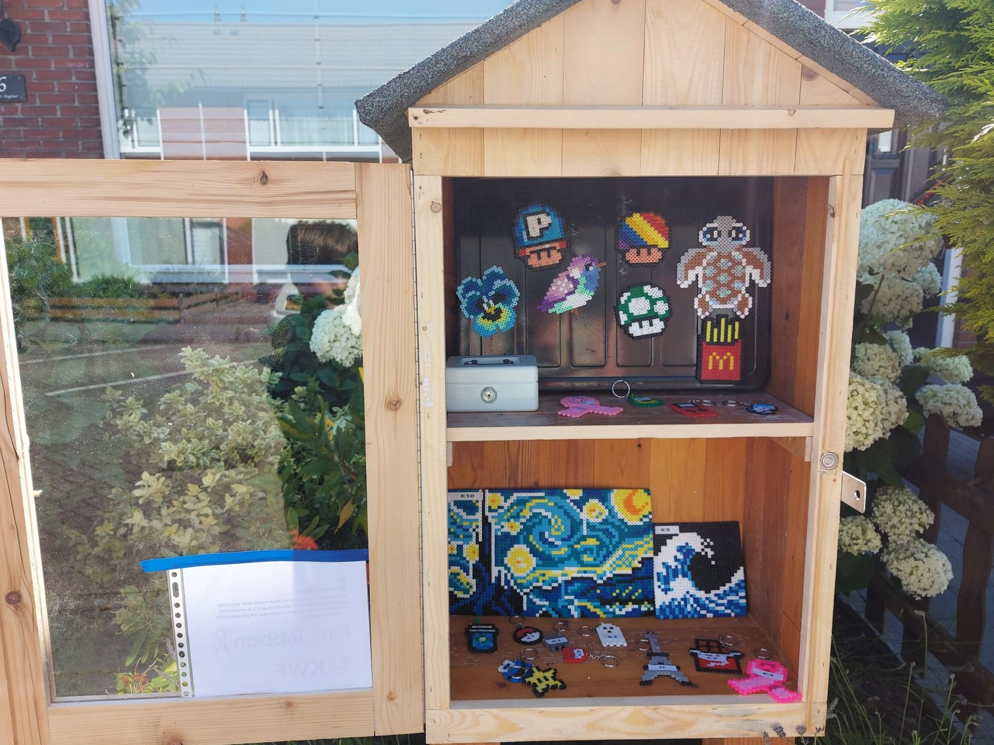 Toen de broers te horen kregen dat hun moeder borstkanker had, besloten ze in actie te komen. ‘’We vinden het erg leuk om creaties te maken met strijkkralen’’, vertelt Koen, de oudste van de twee. ‘’Daarom verkopen we deze voor twee goede doelen.’’ Sinds dinsdag staat er een boekenkastje in hun voortuin aan de Smirnofflaan 16 in Hoogerheide. ‘’Mensen kunnen hier iets uitkiezen, de prijs staat op het werkje vermeld. In het geldkistje kunnen zij dan het geld doen.’’ De opbrengst gaat naar Pink Ribbon en KWF.