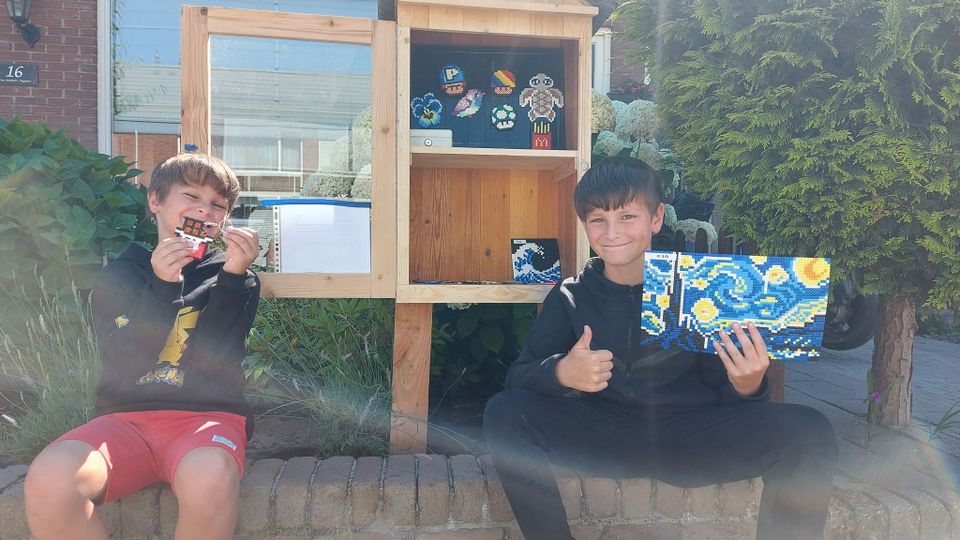 Toen de broers te horen kregen dat hun moeder borstkanker had, besloten ze in actie te komen. ‘’We vinden het erg leuk om creaties te maken met strijkkralen’’, vertelt Koen, de oudste van de twee. ‘’Daarom verkopen we deze voor twee goede doelen.’’ Sinds dinsdag staat er een boekenkastje in hun voortuin aan de Smirnofflaan 16 in Hoogerheide. ‘’Mensen kunnen hier iets uitkiezen, de prijs staat op het werkje vermeld. In het geldkistje kunnen zij dan het geld doen.’’ De opbrengst gaat naar Pink Ribbon en KWF.