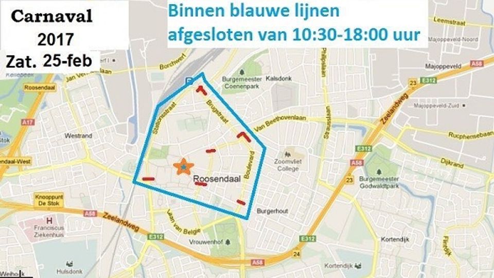 Vanwege de carnavalsoptocht van Roosendaal is zaterdag het centrum afgesloten voor al het verkeer.