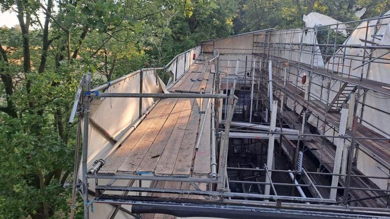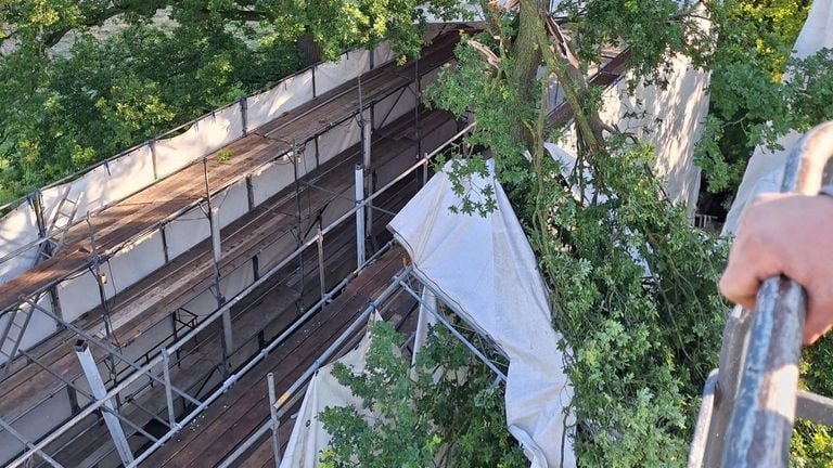 Op het terrein worden de loszittende onderdelen met een bouwkraan veilig naar beneden gehaald. “Zodra dat is gebeurd, gaan we met zijn allen aan de slag. Een nieuw dak is de volgende stap.”