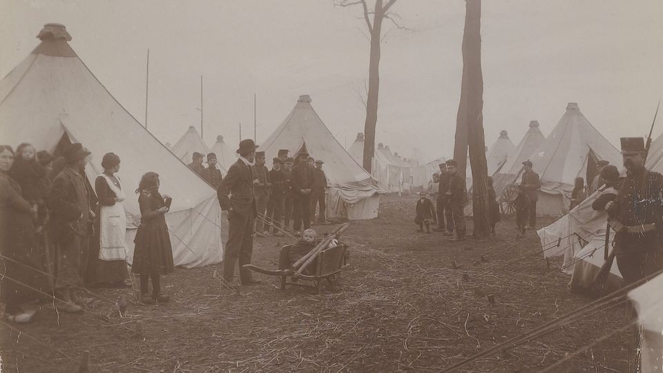 Het Belgische vluchtelingenkamp op het toen nog onbebouwde Plein XIII in 1914. Op vrijwel dezelfde plaats worden nu weer oorlogsvluchtelingen opgevangen. (Foto: West-Brabants Archief)