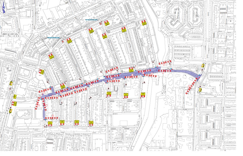 Op de kaart hieronder is het werkgebied aangegeven in een donkere kleur. Ook zie je in het rood de wegafsluitingen rond de Berkstraat, de Gentiaanstraat en de Ericalaan in Bergen op Zoom.