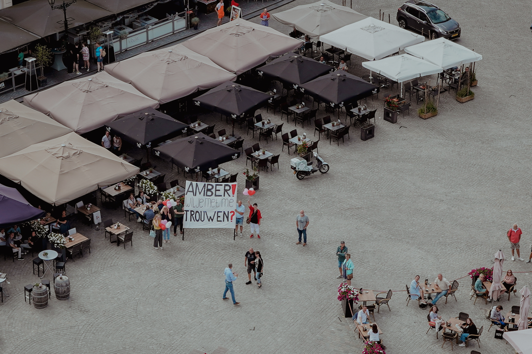 Het stel kwam langs de achterzijde de Peperbus op, dus besloten ze een rondje te lopen. Fotografe Deniece Brouwer wilde vervolgens een foto maken met zicht op de Grote Markt. Amber: “Toen Dirk-Jan naar beneden wees, dacht ik eerst: wat zijn die mensen daar nou aan het doen?” Vrijwel meteen herkende ze haar ouders en schoonouders, die het spandoek omhoog hielden. “Ik keek naar de Grote Markt en las: ‘Amber! Wil je met me trouwen?’. Toen ik hem zag knielen, wist ik dat het ging gebeuren. Echt een heel mooi, romantisch moment.”