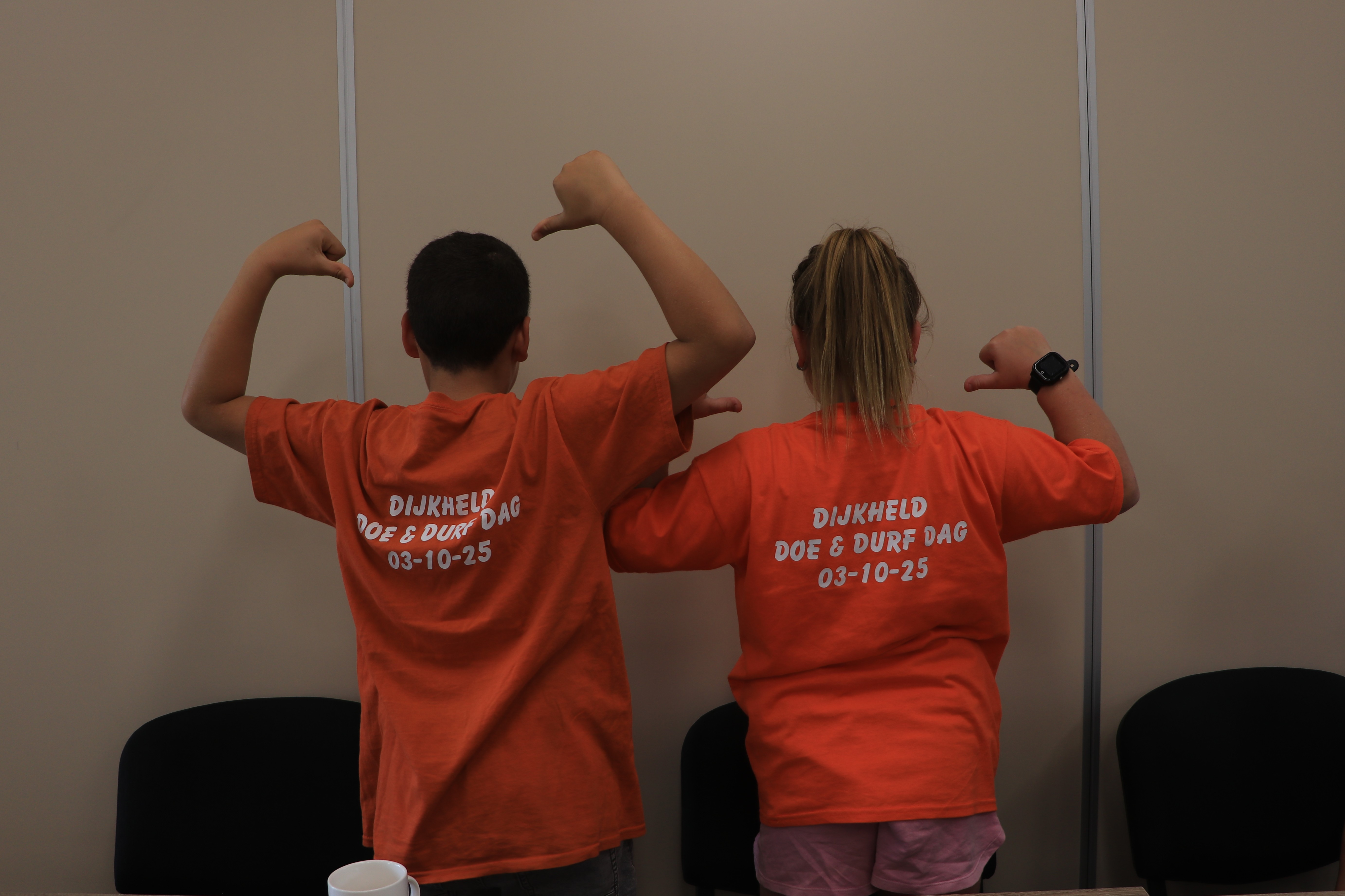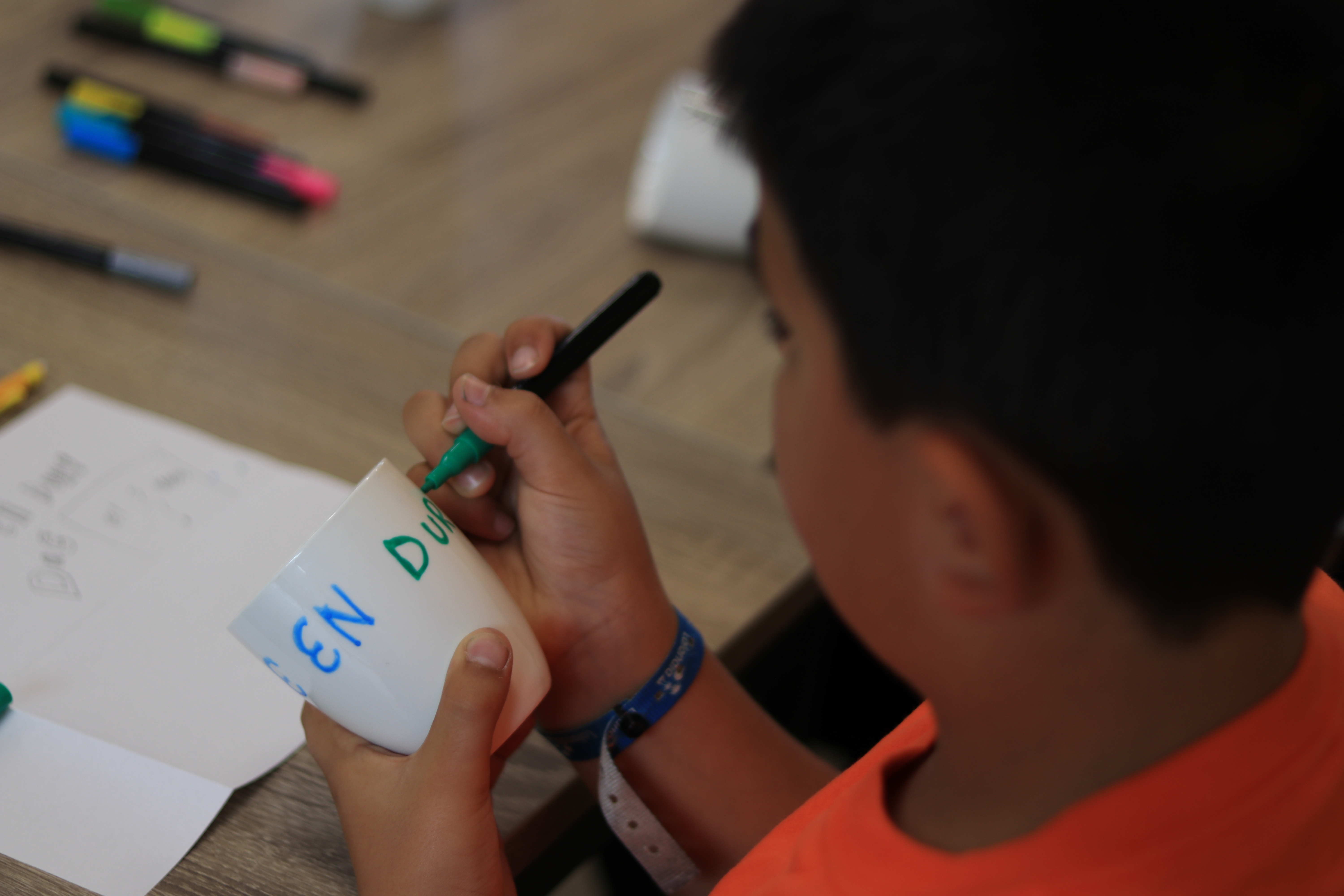 Nadat de stand van zaken is doorgenomen, worden de jonge vrijwilligers aan het werk gezet. Er moeten nog cadeautjes gemaakt worden voor de mensen die helpen bij de Doe & Durf dag, als bedankje. Daarvoor versieren ze elk drie mokken.