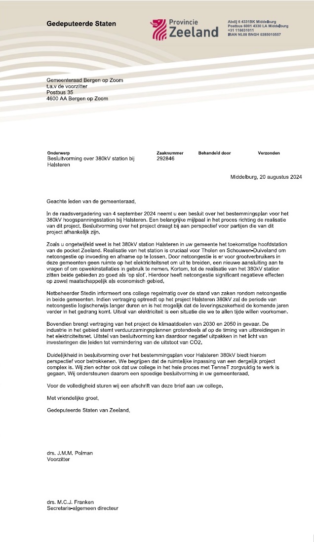 De Bergse politiek staat onder steeds grotere druk om haast te maken met de finale besluitvorming over het nieuwe 380KV-station. Ook de provincie Zeeland roept de Brabantse gemeente op om de keuze niet langer uit te stellen: volgens gedeputeerde Jo-Annes de Bat dreigt anders stroomuitval op Tholen en Schouwen-Duiveland. De Bergse raad heeft eerder al besloten om het station bij gemaal De Pals te plaatsen, maar omwonenden willen een laatste kans voor bedrijventerrein De Spie bij Sabic.