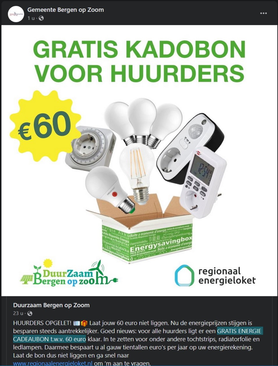 Op woensdag 9 februari, aan het eind van de middag, deelde de Gemeente Bergen op Zoom een Facebookbericht van het Regionaal Energieloket. Dat belooft “GRATIS ENERGIE CADEAUBON t.w.v. 60 euro”, met hoofdletters zelfs. Wel even goed lezen: voor huurders! Voor huiseigenaren bleken ze al op. Een aanvraag indienen kan nog wel, ook als je niet huurt, want er is een wachtlijst. Het is dus zaak om je je contactgegevens in te vullen.