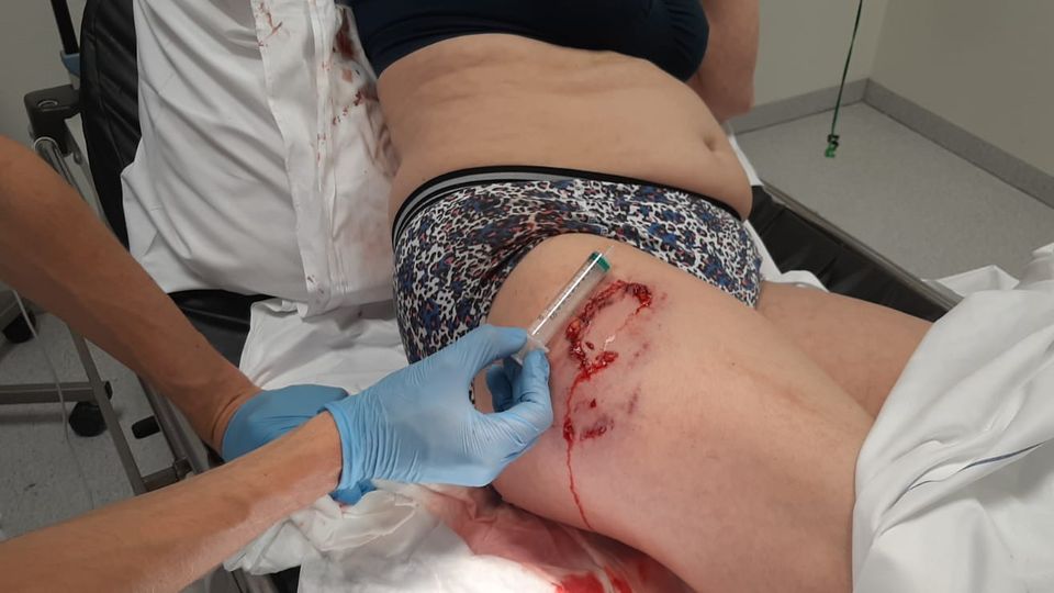 Edith is er zelf ook nog van aan het bijkomen, vertelt ze, terwijl ze rustig uit een bekertje koffie drinkt. Ter plekke werd ze behandeld door ambulancepersoneel, die haar voor verder onderzoek meenamen naar het ziekenhuis. “Daar zijn mijn wonden flink schoongespoeld. Na wat verdovingen hebben ze de flap er weer overheen gelegd en met moeite aan elkaar gehecht.”