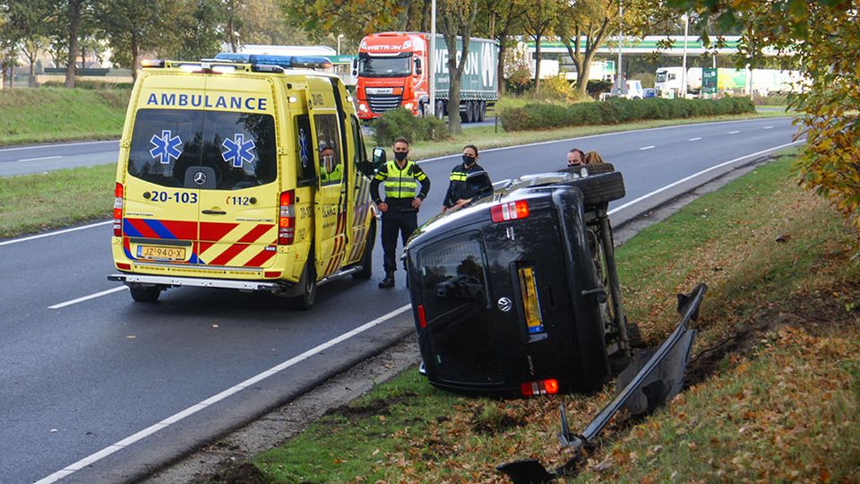 Een bestelbus is vrijdagochtend op de Randweg-West bij Bergen op Zoom op zijn kant terecht gekomen nadat de bestuurder uitweek voor een eend.