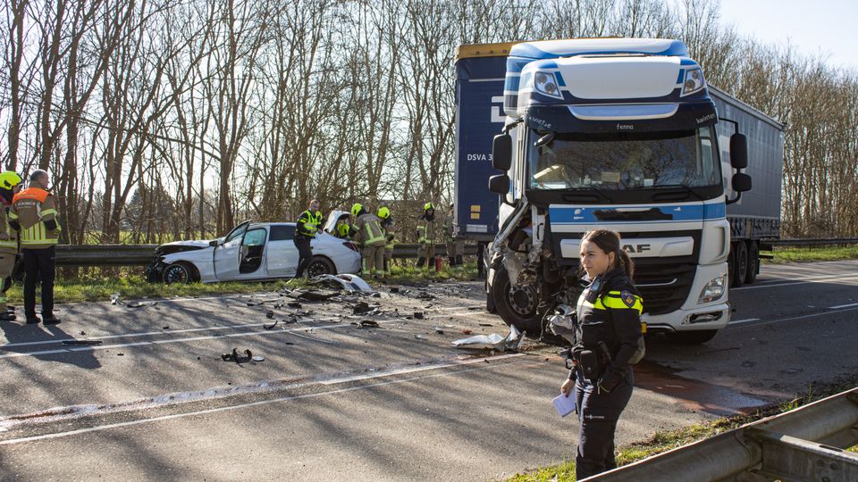 Eendrachtweg bij Halsteren dicht door ravage na ongeval tussen auto en vrachtwagen