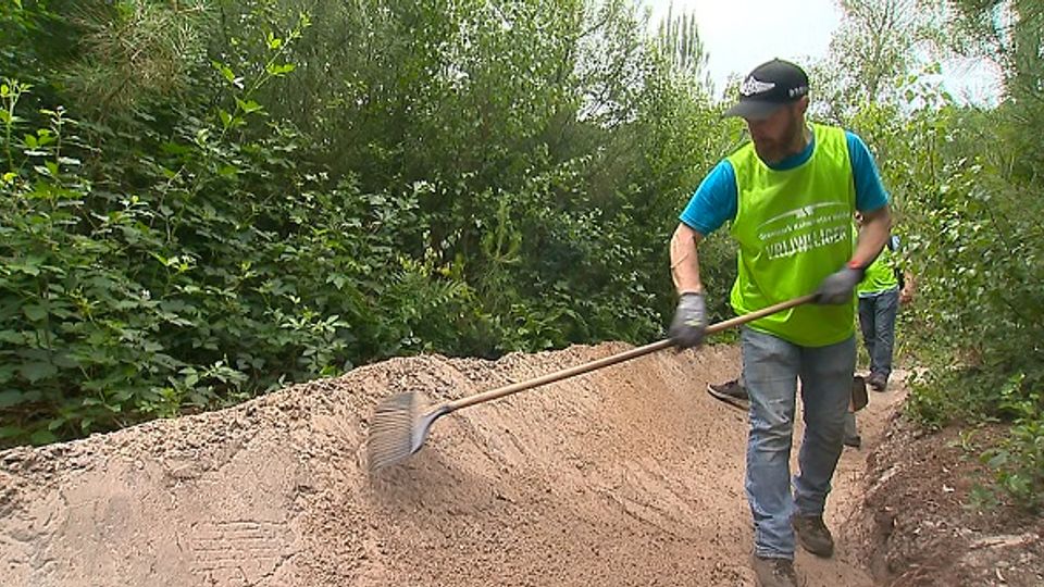 Vrijwilliger helpt bij de aanleg van een mountainbikeroute