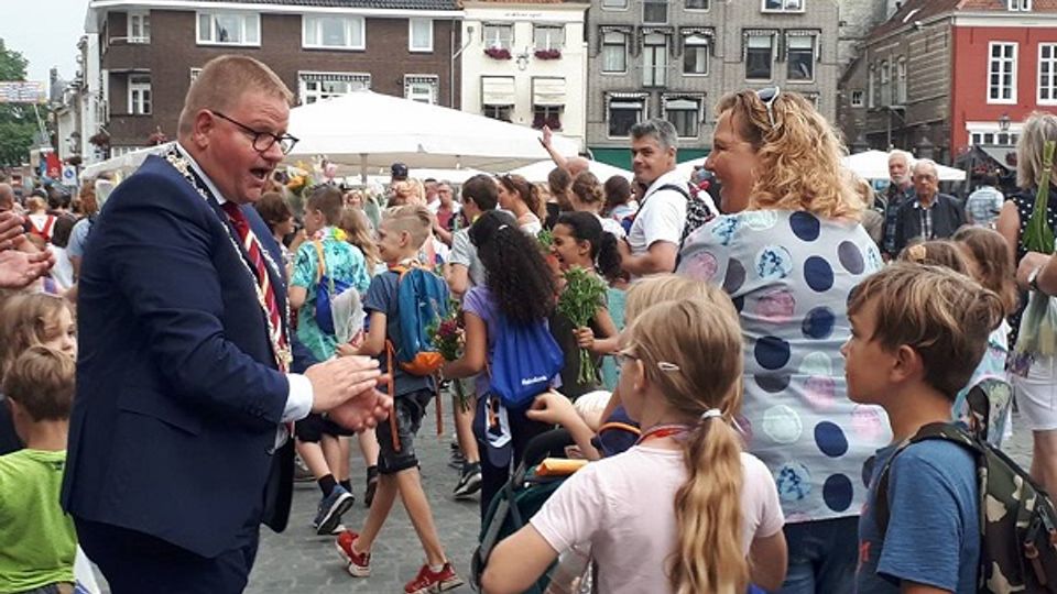 Loco-burgemeester Patrick van der Velden moedigt de lopers aan tijdens het defilé in 2018 © Avondvierdaagse Bergen op Zoom