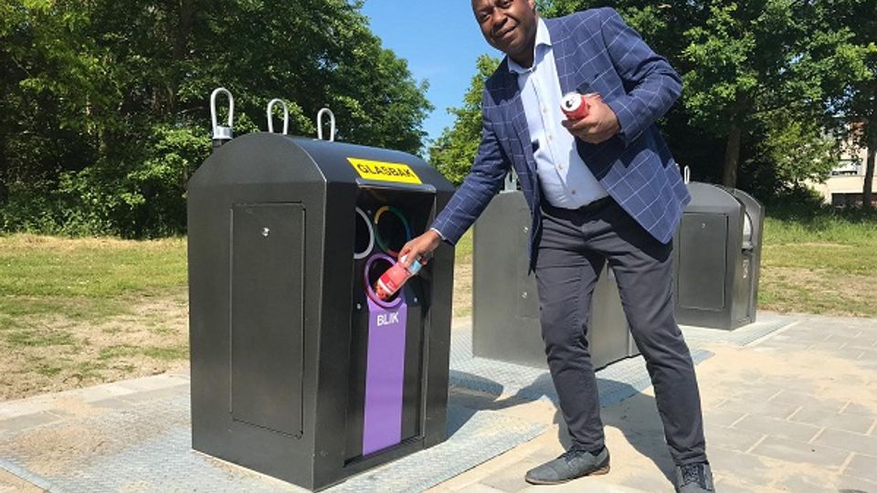 Wethouder Andrew Harijgens opende de eerste glasbak met een apart vak voor blik