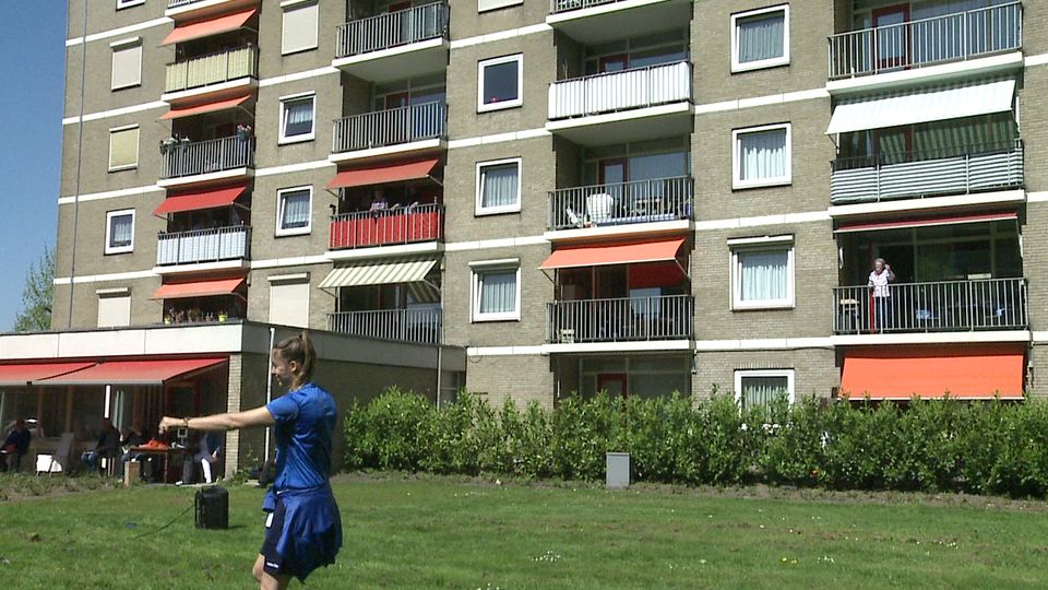 Met twee grote geluidsboxen verschijnen de beweegcoaches op het grasveld tussen de Mimosaflat en Clemetisflat. Nieuwsgierige bewoners verzamelen zich op hun balkon. “Aangezien we allemaal thuiszitten en niet zomaar naar buiten kunnen of naar de bingo kunnen gaan, hebben we wat leuks bedacht”, vertelt beweegcoach Mandy Buijs van Sportservice Noord-Brabant (SSNB).