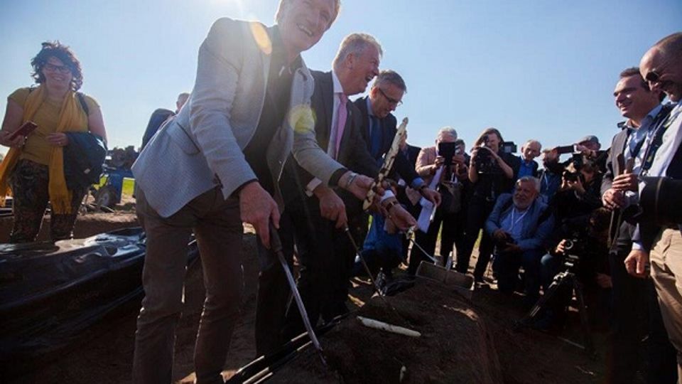 Burgemeester Frank Petter van Bergen op Zoom, burgemeester Ruud van den Belt van Steenbergen en wethouder Hans de Waal van de gemeente Woensdrecht hebben donderdagmiddag de eerste Brabantse Wal Asperges gestoken.