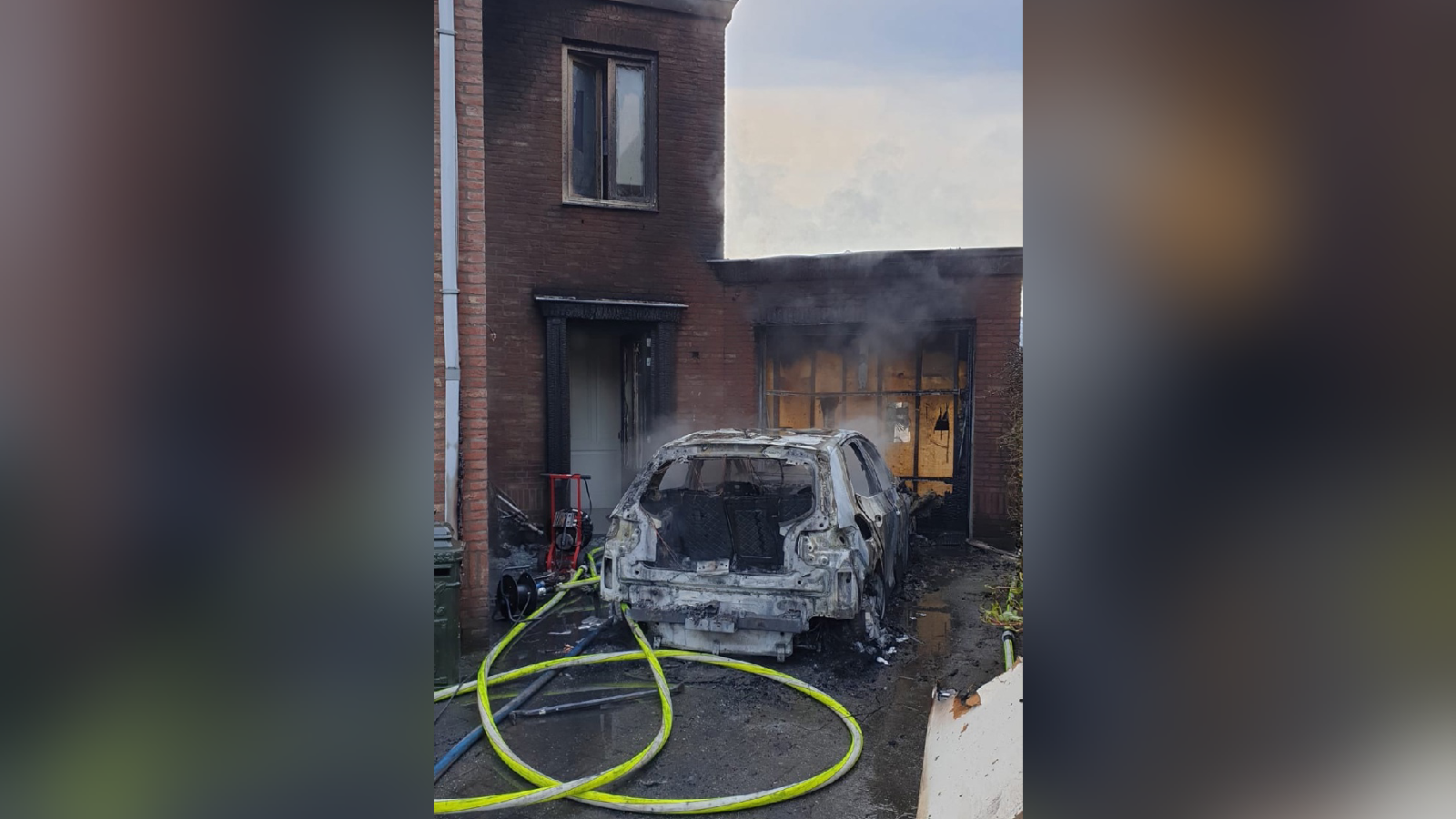 Elektrische auto in brand, vuur slaat over naar garage van woning