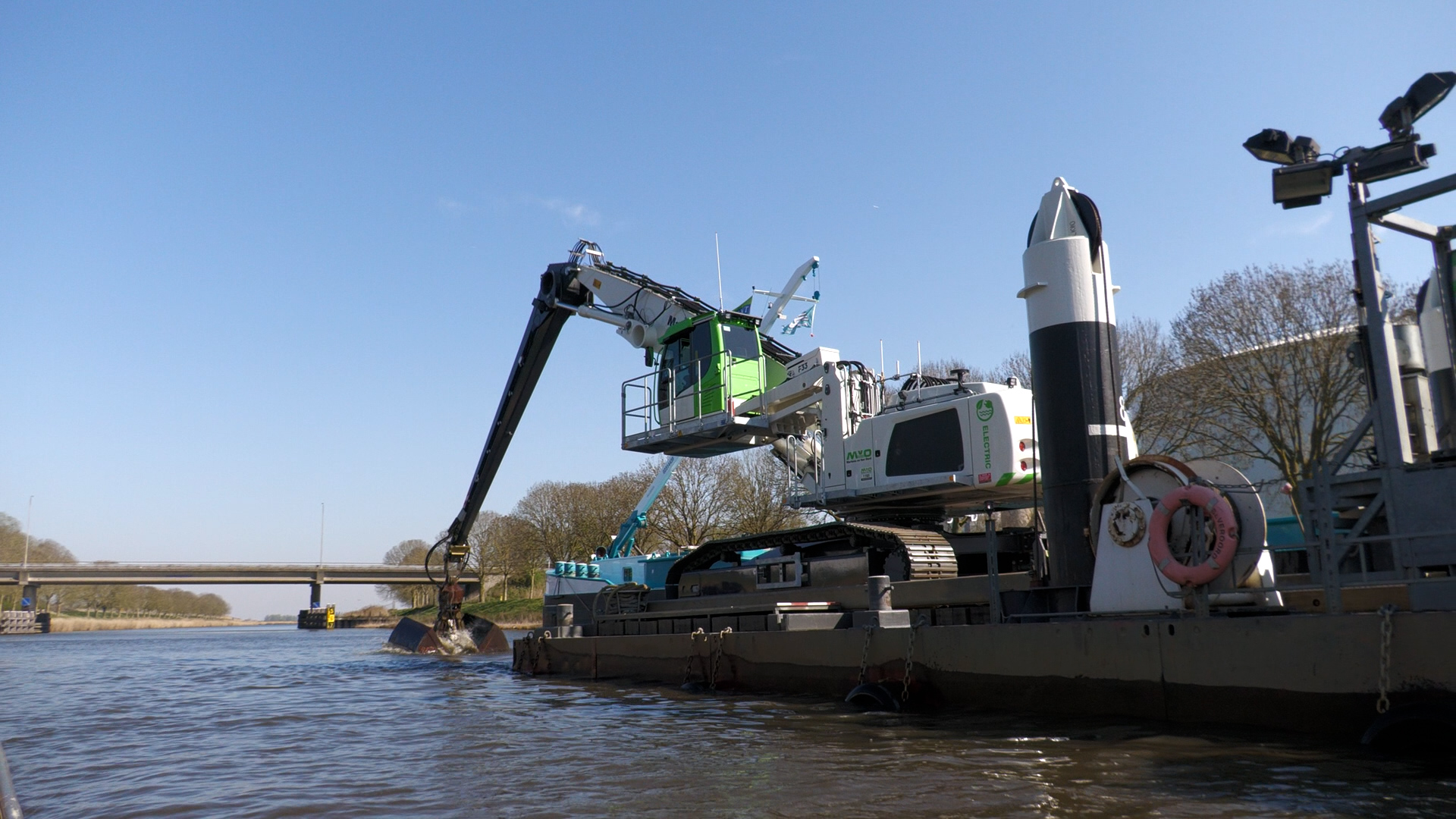 Een grote kraan op een ponton die bagger van de bodem van het Mark-Vlietkanaal schept, is niet alleen een imposant gezicht. Het is ook een duurzame primeur! Voor het eerst wordt er volledig emissieloos gebaggerd. Dankzij elektrische schepen en graafmachines wordt de waterweg uitgebaggerd zonder uitstoot van schadelijke stoffen.