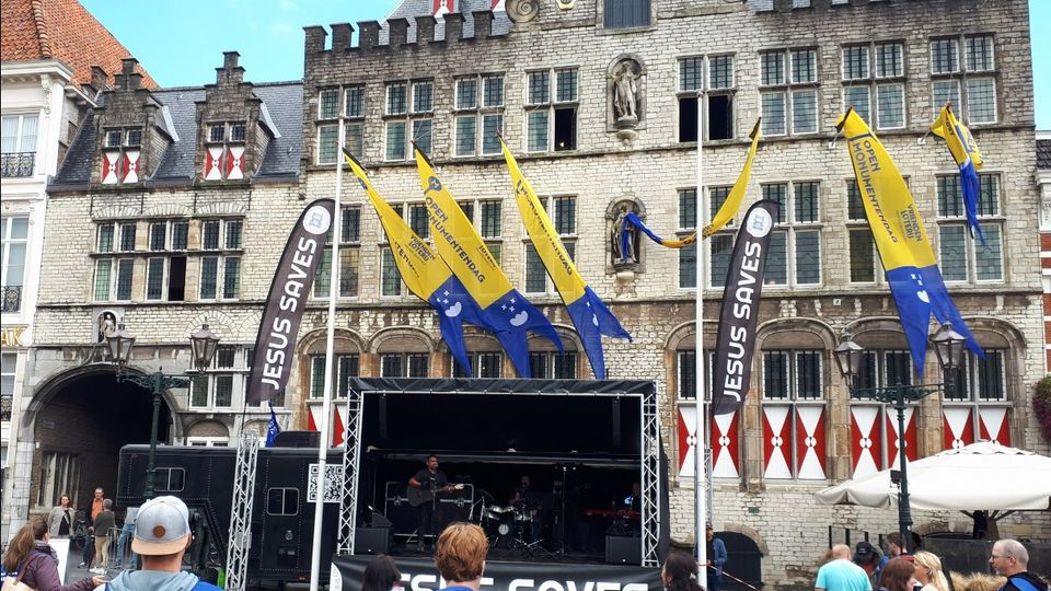 Tijdens de jaarlijkse Open Monumentendag staan dit weekeinde de Bergse topmonumenten extra in de aandacht. Zo ook het Oude Stadhuis op de Grote Markt. Helaas blijkt zaterdagmiddag het uitzicht ontsierd door een groot podium en een trailer van de christelijke muziekgroep Jezus Saves. Dit tot ergernis van bezoekers én van de Bergse raadspoliticus Louis van der Kallen.