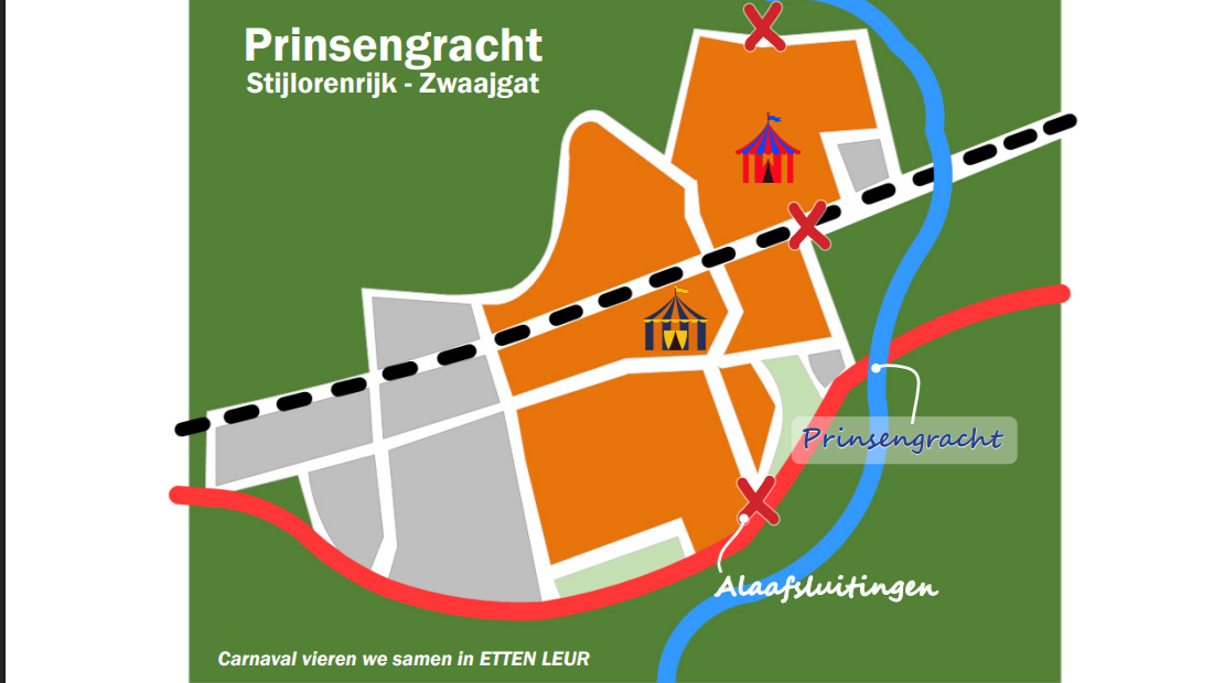 In een officieel persbericht laten de carnavalsstichtingen van zowel ’t Stijlorenrijk als het Ut Zwaajgat weten dat ze een alaafsluiting van alle toegangswegen willen. Op deze manier willen de carnavalsclubs in Etten en Leur carnavalsvierders in eigen dorp houden. Feestforenzen die verkleed de gemeente uitgaan, zullen worden beschoten met een confettikanon.