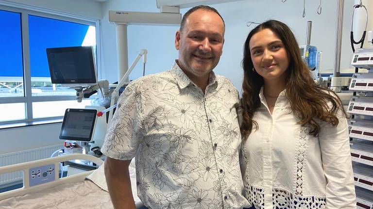 Dochter Jane (20) geeft haar vader een knuffel wanneer ze merkt dat hij het te kwaad krijgt. “Het was ook heel intens. We kwamen elke dag op bezoek maar we konden niet meer dan doen dan je een kus geven en een washandje over je voorhoofd halen want je lag zo enorm te zweten. We zijn altijd positief gebleven, het hield ons op de been. Zelfs op het moment waarop het mis zou kunnen gaan. Gelukkig is dat niet gebeurd.”
