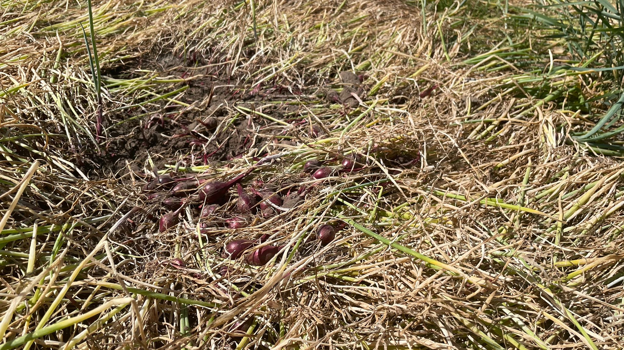 Het resultaat: een uitgedroogd veld met kleine uien. “Zo zonde, maar ja, we kunnen er niks aan doen.” Door de warmte krijgen de planten stress en stoppen ze met groeien. “Ga zelf maar eens in de volle zon staan met 35 graden, daar wordt je ook niet blij van.”