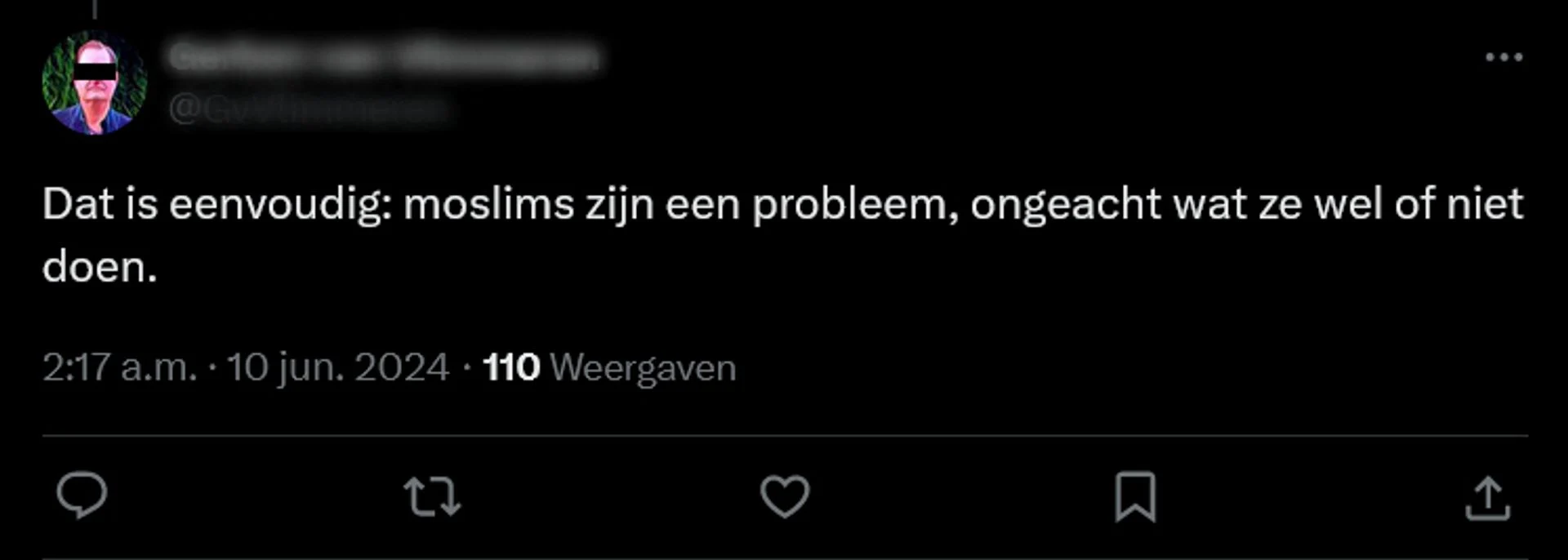 Het gaat om berichten waarin de man stelt dat moslims ‘de echte fascisten’ en ‘de traditionele nazi’s’ zijn. “Moslims zijn een probleem, ongeacht wat ze wel of niet doen”, schrijft hij. In andere berichten meldt hij dat er ‘niks vreedzaams’ aan de islam is. Op een tweet van Geert Wilders die Jesse Klaver een ‘smerige ophitser’ noemt reageert hij met ‘verwacht je wat anders van een halve Marokkaan, dan?’