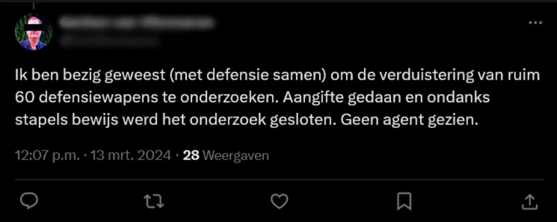 In berichten op social media schrijft hij dat hij, in die hoedanigheid, in het verleden de overheid heeft geholpen bij een onderzoek naar verdwenen defensiewapens.