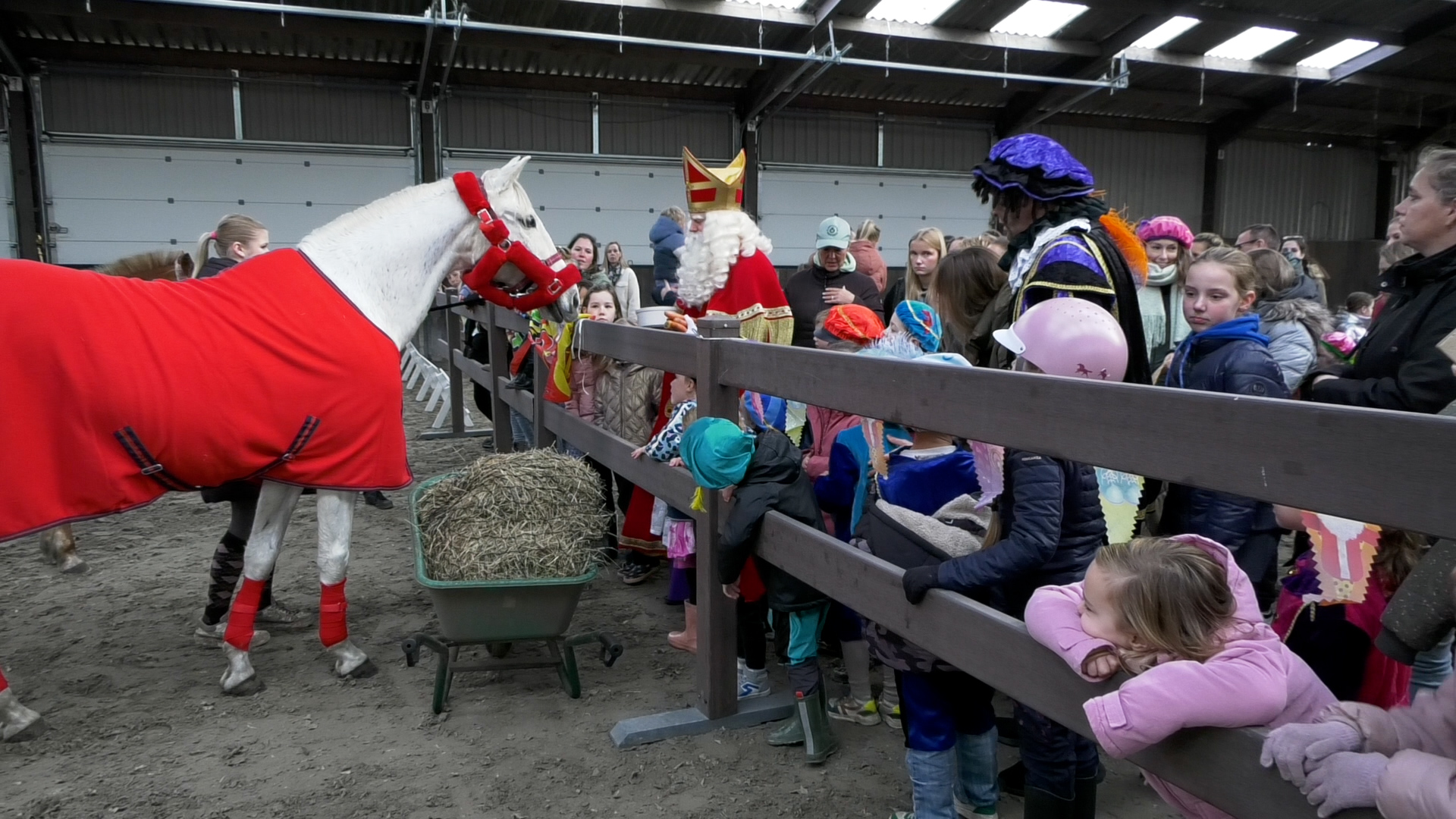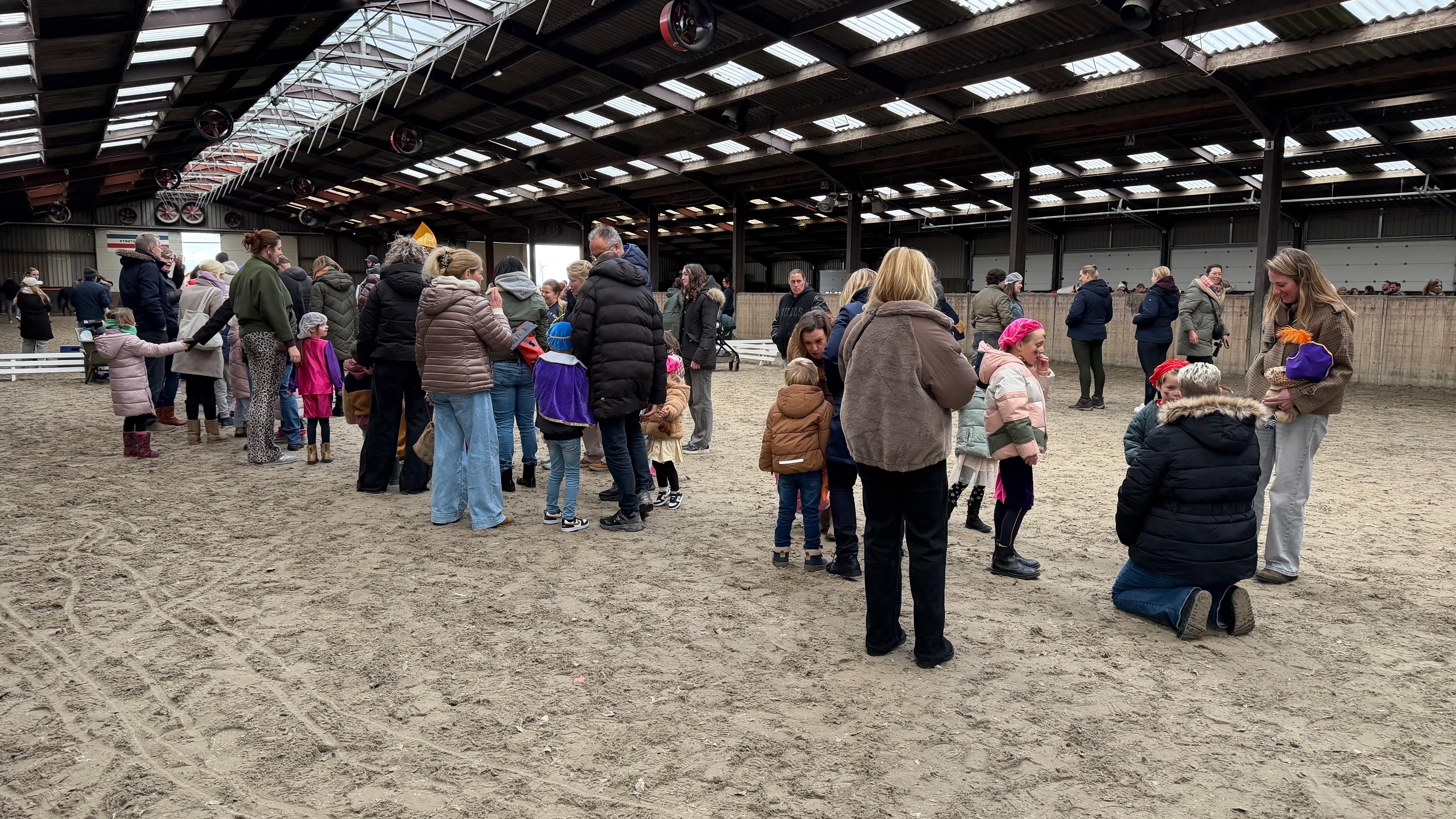 Als Sinterklaas rond het middaguur de stal binnenkomt, rennen alle kinderen de paardenbak in, recht naar het hek, waar het paard voor komt te staan. Sinterklaas schud kinderen de hand en gaat met iedereen op de foto. Ook worden ze verwend door de pieten met pepernoten. In de andere bak staat er een enorme rij om ponny rijden. “Ik ben al twee keer geweest”, vertelt Laura.