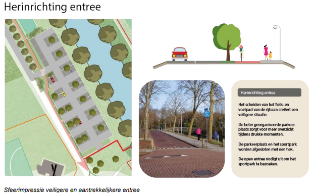 “Uit gesprekken met omwonenden is gebleken dat de entree onveilig is”, vervolgt wethouder Malfait. Er hangen regelmatig jongeren rond, en bovendien rijden fietsers en auto’s kriskras door elkaar. Daarom wordt de parkeerplaats bij de hoofdentree opnieuw ingericht. Het is de bedoeling dat de parkeerplaats meer in het zicht komt, zodat het hangjongeren afschrikt. Daarnaast wil het college graag dat het fietspad wordt gescheiden van de weg/de parkeerplaats. Ook vergroening staat op het prioriteitenlijstje. De kosten hiervoor worden geschat op 485 duizend euro.