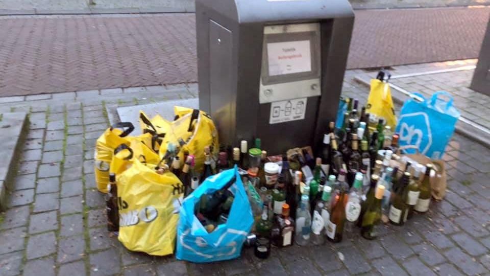 Lege flessen gaan nu nog bij de afvalcontainer. (Foto: Marcella van Broekhoven (Facebook)