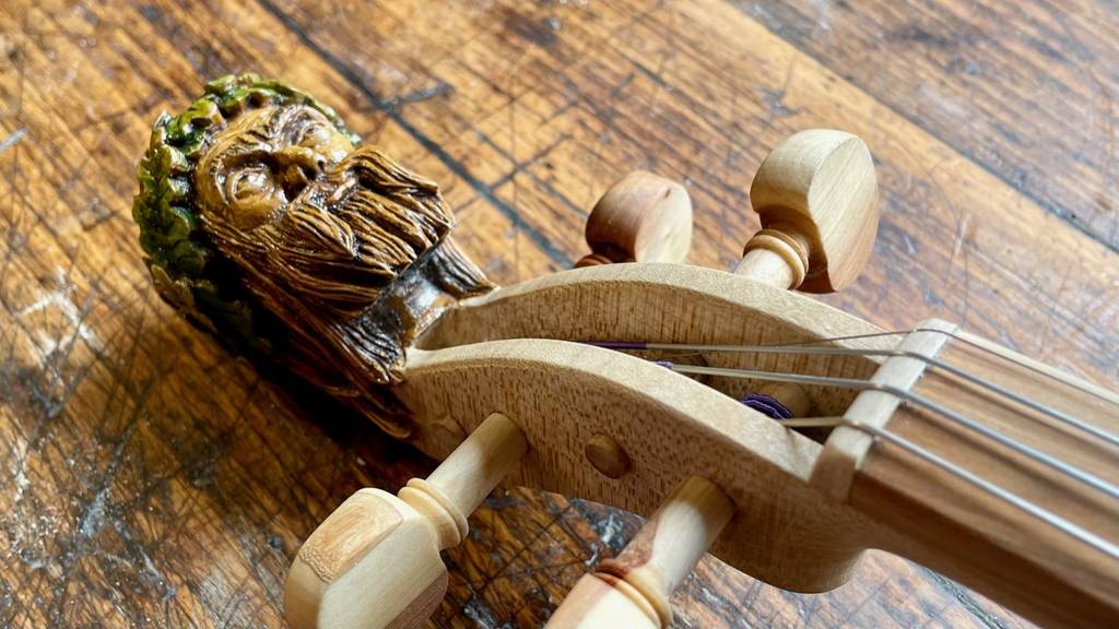 Het fraaie houtsnijwerk aan het einde van de hals is van een van de twee wildemannen die ook het stadswapen siert. Op het staartstuk van het instrument is een klein ansjovisje zichtbaar. “Dat heb ik van parelmoer gemaakt van een zwanenmossel uit de Binnenschelde.”