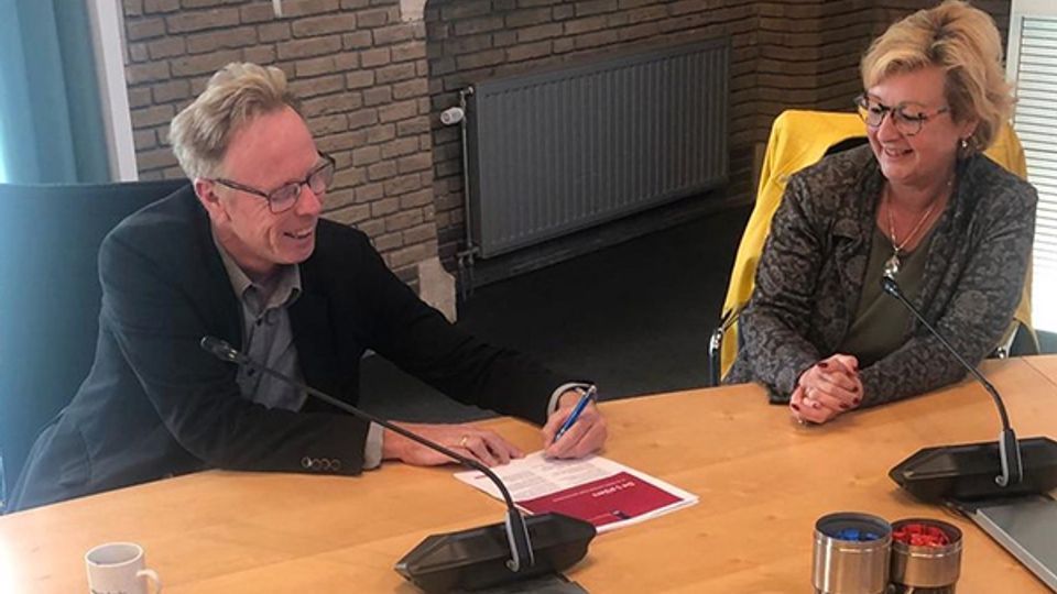 Lars van der Beek (wethouder gemeente Woensdrecht) en Lenny Winkel (BWI) ondertekenen actieplan Eén tegen eenzaamheid