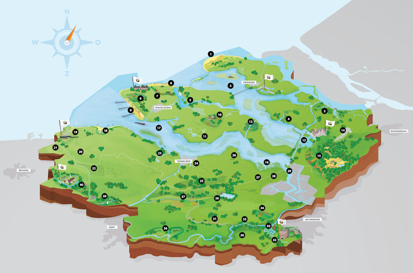 Nu gaan de regionale erfgoedorganisaties volop aan de slag met het keurmerk. Zo ook Het Markiezenhof in Bergen op Zoom, dat zich ontwikkelt tot ‘onthaalcentrum’ voor het gebied – en de contouren van de verdronken stad Reimerswaal bij Tholen worden weer zichtbaar gemaakt. Langs de belangrijkste toegangswegen van en naar Zeeland staan bij de provinciegrens nu al informatieborden met het Geopark-logo. “Dat is ook een vereiste van Unesco voor toekenning van het keurmerk”, zegt hij. Het is de bedoeling dat ook in het Brabantse deel deze borden komen te staan