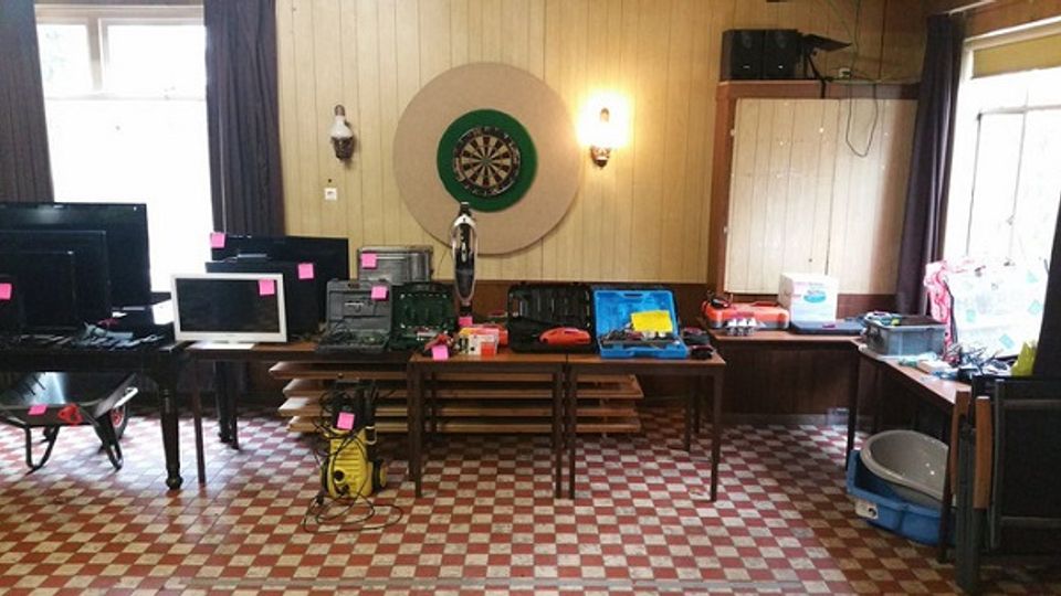 Naast de televisietoestellen vond de politie ook een kruiwagen en boormachines.