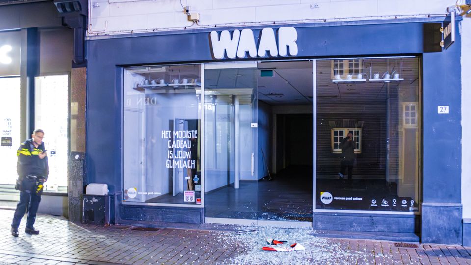 Glazen deur valt uit winkelpand in Bergen op Zoom: brandweer rukt uit