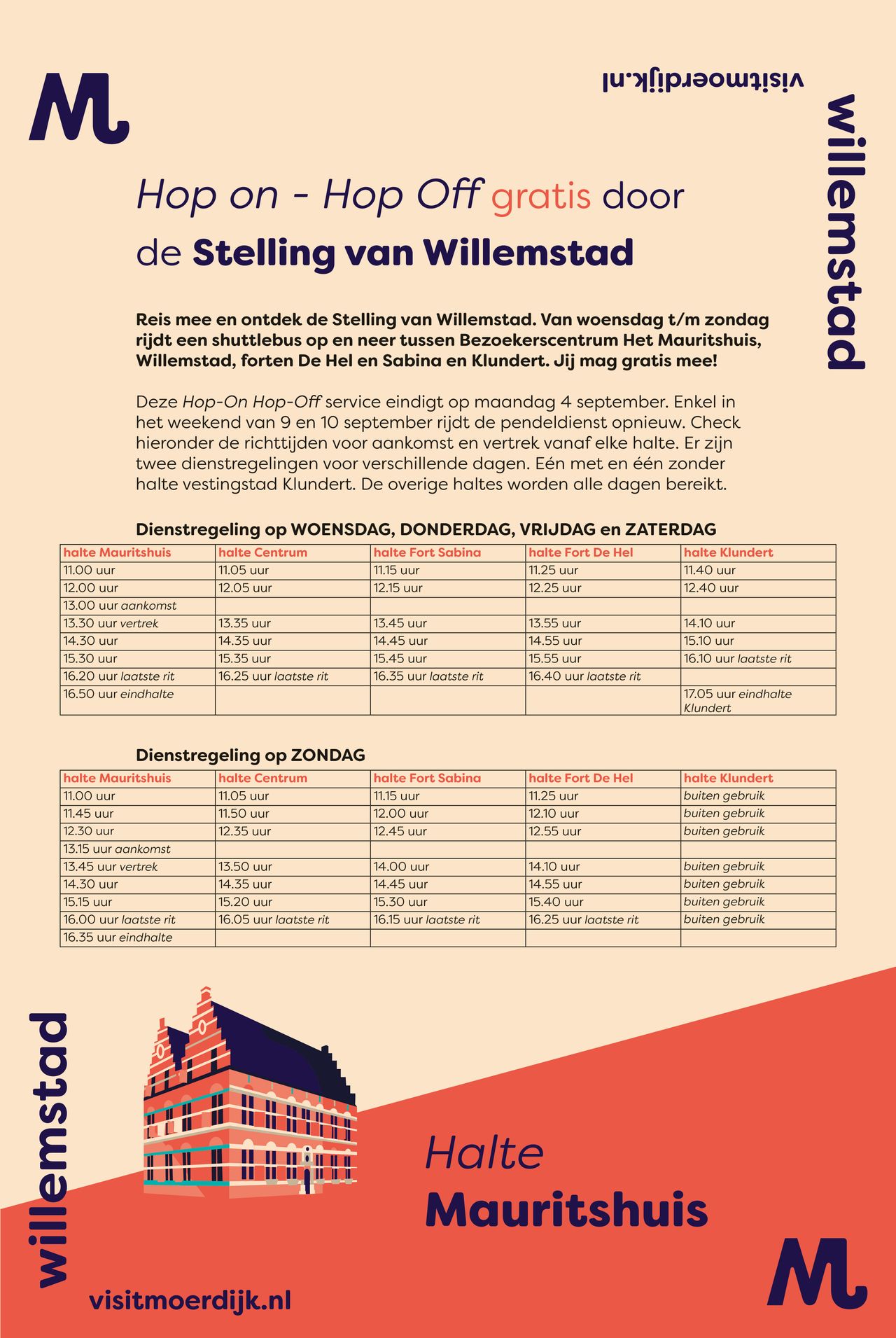 De komende maanden rijdt er weer een gratis pendelbus langs de bezienswaardigheden van Willemstad. Deze shuttle rijdt elke week van woensdag tot en met zondag. De route gaat heen en weer langs de Stelling van Willemstad. De haltes zijn bij het bezoekerscentrum Het Mauritshuis, het centrum van Willemstad, fort De Hel, fort Sabina en in Klundert. Er is één uitzondering: op de zondagen rijdt de bus alleen rond Willemstad en dus niet naar Klundert.
