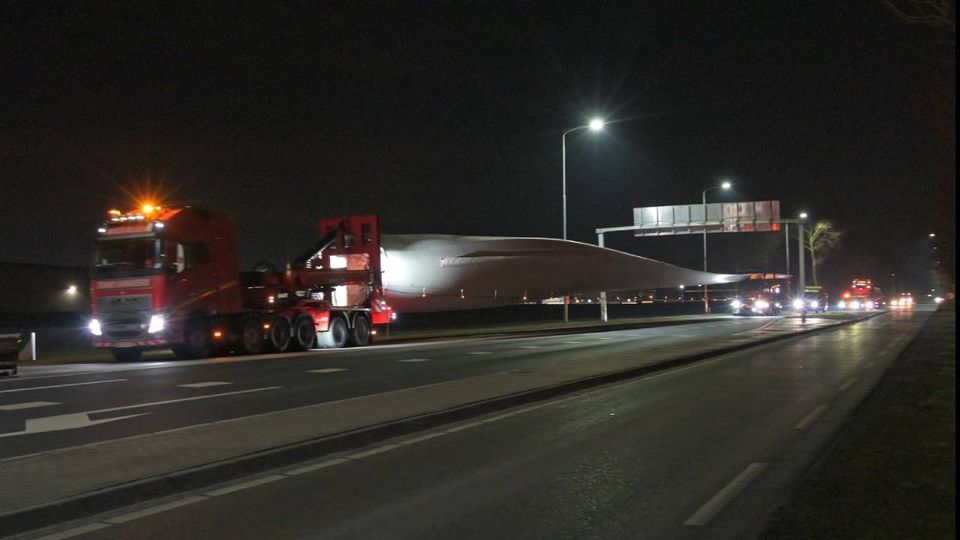Een gigantische wiek van bijna 65 meter lang is dinsdag vervoerd van Moerdijk naar Dinteloord. Het gaat om de eerste wiek voor het Windpark Karolinapolder bij Dinteloord. Een grote operatie, want het onderdeel moest vanwege z’n omvang met een enorme omweg over de A17, A58, A4 en A59 worden gereden.