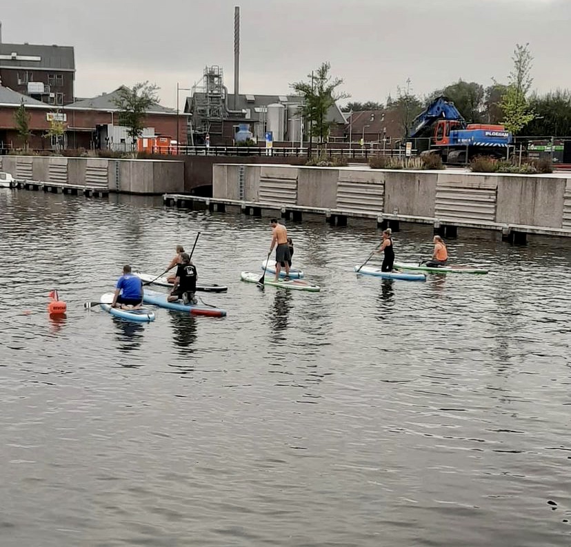 Het is dan ook doodstil in de zaal wanneer trainer Kevin Naarden een work-out op het witte bord schrijft. Skiën op een apparaat en een grote zware zwarte plaat binnen over de groene kunstgrasmat schuiven. Maar als hij de sporters verzoekt om mee naar buiten te gaan, ontstaat er verwarring. Iedereen volgt, niet wetende dat zij over enkele ogenblikken op een supboard een ronde over de Roosendaalse Vliet gaan peddelen. “Ik denk dat niemand dit aan heeft zien aankomen. Bij CrossFit denk je niet gelijk aan suppen”, zegt Sabrina.