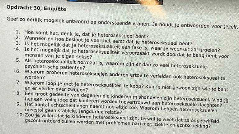 Een screenshot van de bewuste opdracht gaat al enige tijd rond op social media. Er zijn tien vragen te zien waarbij de lezer aangesproken wordt op zijn of haar heteroseksualiteit: