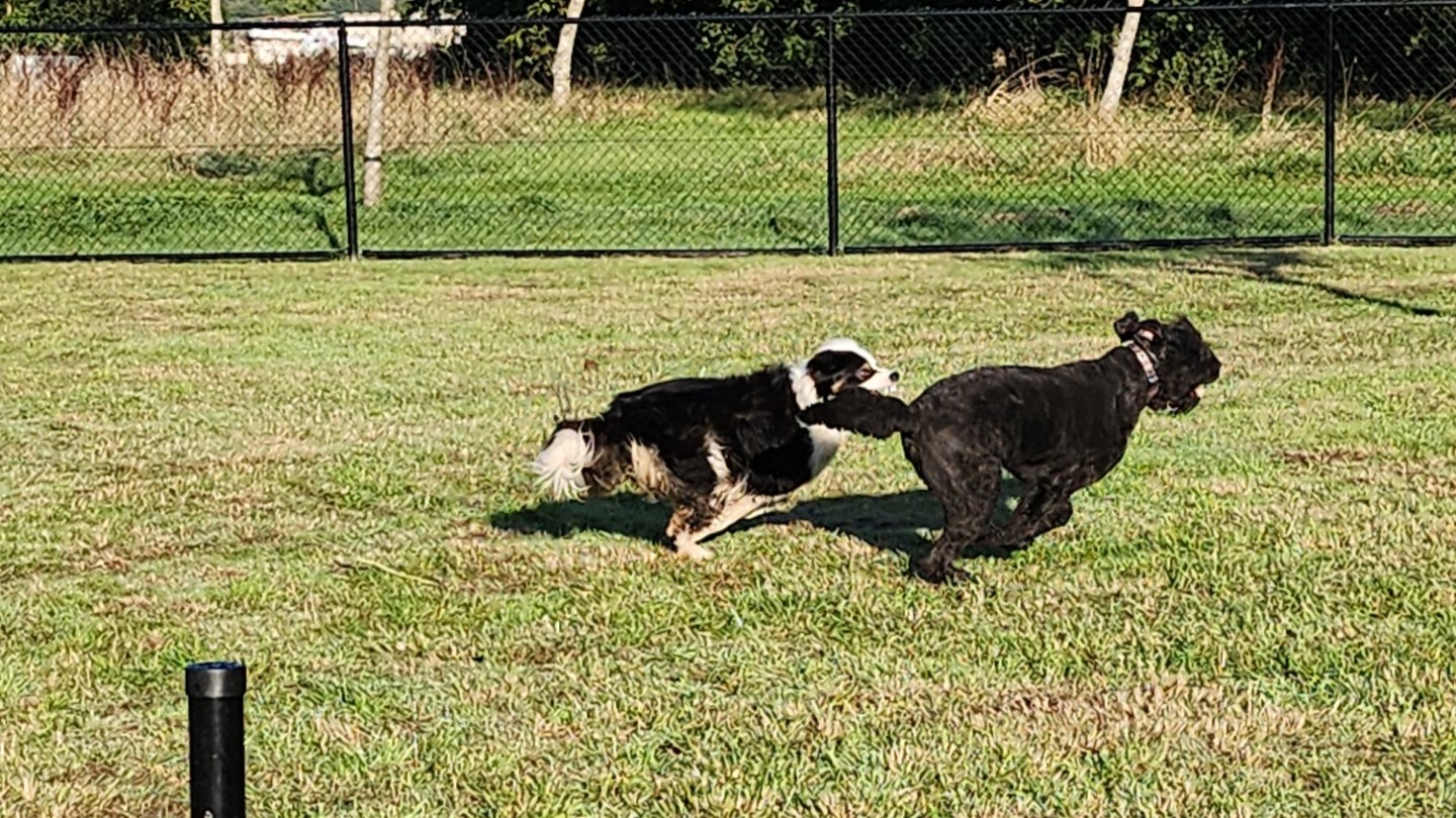 Omdat er voorlopig geen zicht is op verbetering van het veld, en het perceel straks toch kapot wordt gereden voor het herstel, is besloten om de speelplaats weer te openen. “Dan maakt het toch niet uit dat het gras helemaal kapot gelopen wordt. Mensen die het niet erg vinden dat hun hond vies en nat wordt, zijn dus welkom!” Daar is gelijk al gretig gebruik van gemaakt. Marion is er zelf ook alweer even geweest met haar hond Henkie.