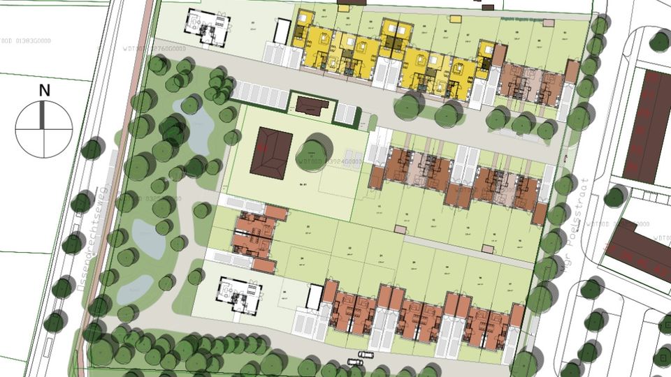 Het plan voorziet in een duurzaam en veelzijdig aanbod: negen drie-onder-éénkapwoningen, acht twee-onder-één-kapwoningen, zes levensloopbestendige woningen en twee bouwkavels.