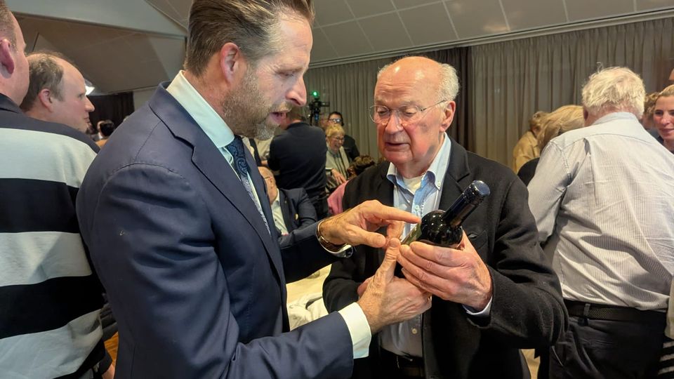 Hugo de Jonge neemt van een bezoeker een fles wijn in ontvangst, tijdens de nieuwjaarsreceptie van de gemeente Tholen.