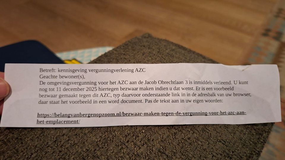 In de omgeving van de Jacob Obrechtlaan is recent een briefje verspreid door onbekenden, waarin bewoners worden geïnformeerd over de verleende omgevingsvergunning voor het aanstaande asielzoekerscentrum (azc). Het strookje papier, dat huis-aan-huis is verspreid, vermeldt dat inwoners nog tot 11 december de mogelijkheid hebben om bezwaar te maken tegen de vergunning.