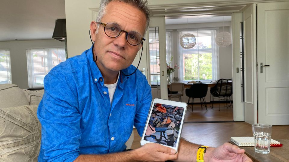 Raymond met een foto van honderden aangespoelde reddingsvesten. (Foto: Sven de Laet)