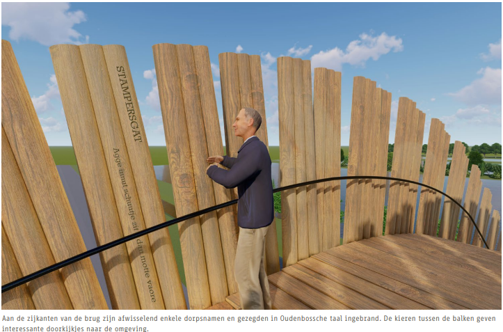 Het uiterlijk van de brug moet robuust worden, met grove houten stammen en planken. “Er zijn tegenwoordig veel manieren om houten bruggen tientallen jaren mee te laten gaan”, weet Melisse te vertellen. De houten constructie verwijst namelijk naar het Pagnevaartbos. In het Pagnevaartbos stond rond 1977 namelijk ook zo’n houten brug met grove stammen. Die brug is dan ook de inspiratiebron voor de nieuwe brug. Bovenop de brug zelf zijn verschillende uitkijkpunten waar wandelaars alle vijf de kernen van de gemeente kunnen zien. Op bordjes zal te zien zijn naar welke kern ze kijken. Ook komen er op de brug gezegden in Oudenbossche taal, zoals: ‘Agge innut schu(i)tje zit dan motte vaore’.