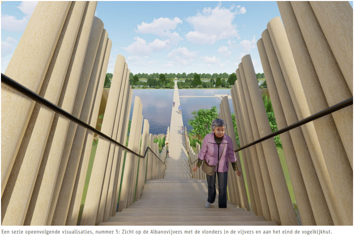 En op die samenwerking is hij trots. “Berno Strootman zelf heeft meegewerkt aan dit project, omdat hij het zo bijzonder vond.” De brug moet de belangrijke missing link worden tussen de twee kernen, en ook het wandelnetwerk tussen de vijf dorpen van Halderberge. Het eerste ontwerp is gemaakt, en bestaat uit twee delen: de brug zelf (kosten: 900 duizend euro) en een wandelpad van hout, waaronder een vlonderpad over de Albanovijvers (kosten: 1,4 miljoen euro). “Maar laten we het voor nu op de plannen voor enkel de brug houden, de rest komt later”, zegt Melisse.